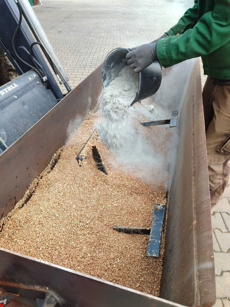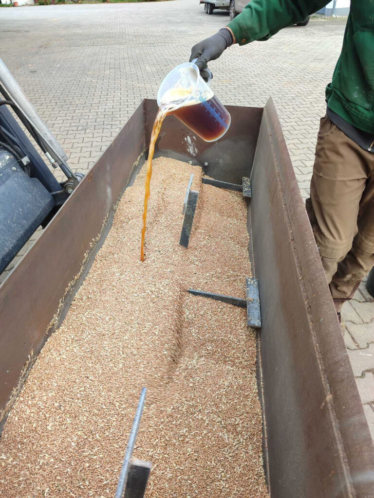 Im Selbstgebauten Beizlöffel wird der Weizen wird mit EM-Aktiv angefeuchtet und mit RoPro 13/20 bepudert. Die Beizung stärkt die Keimung und reduzierte den Steinbrandbefall auf < 50 Sporen/Korn.